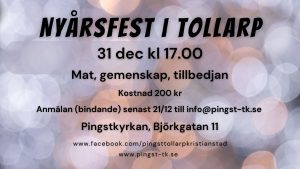 På nyårsafton 31 dec äger Pingstförsamlingens nyårsfest rum med start kl 17.00. Sista anmälningsdag är 21 december (bindande anmälan). Vi återkommer med information om vad det kommer att kosta.